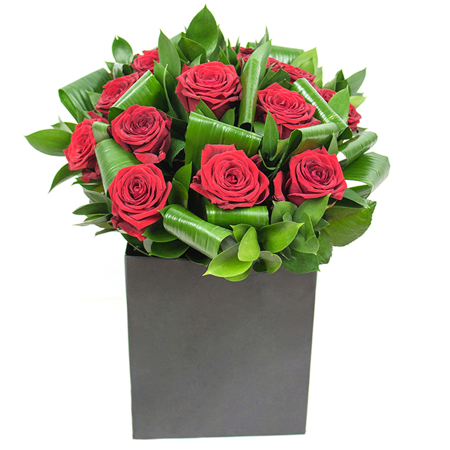 Add a touch of refinement and elegance to your home with our stunning bouquet, featuring vibrant red roses, lush aspidistra leaves, and delicate ruscus. Each flower is carefully selected to ensure the highest quality and lasting freshness.